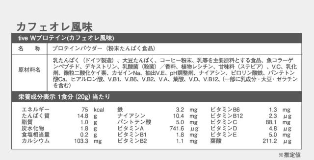 健康な成人の場合、悪影響のない1日のカフェイン摂取量は「400mgまで」、妊娠中の方は「200mgまで」と推奨されています。tiveプロテインカフェオレ風味と、抹茶味にはカフェインを多く含む原材料が使用されておりますので、妊娠中、授乳中の方は、自身の体調を考慮し、過剰摂取にならないようお気をつけください。