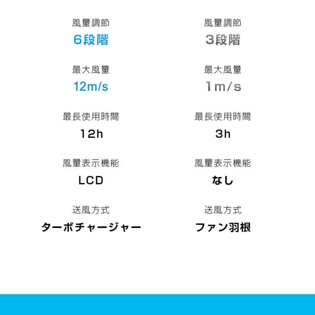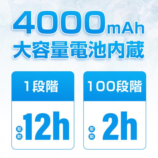 大容量4000mAhバッテリーを搭載し、最大12時間の連続駆動が可能です。充電時間は約3時間と短く、フル充電後は長時間に使用できます。外出先や旅行先でも電池切れを気にせず、一日中涼しい風を提供します。