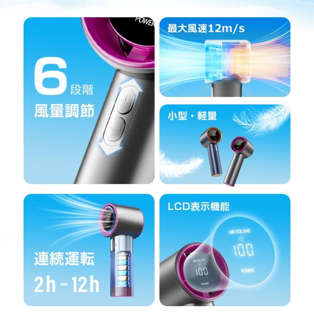 手持ちターボファン 手持ち扇風機 ポータブル扇風機 2025夏 4000mAh 大容量 六段階風量 type-c充電式 残電量表示 ストラップ付き 瞬間冷感 コードレス コンパクト 強風 冷却 超軽量 ミニ 静音 猛暑対策 心地よい風 多種いろ選択 長持ち 高性能 【PL保険加入済み製品・安心】