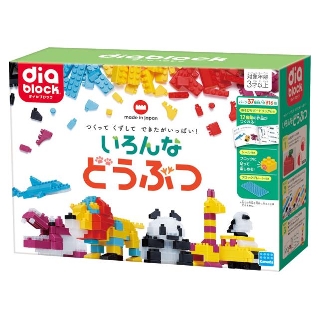 ダイヤブロックから、「どうぶつ」のテーマセットが登場! プレート、ジョイント、タイヤパーツなど、6種の新パーツ入り。長いブロックも入っているので、簡単に大きな作品も作ることができます。また、ジョイントパーツを使ってどうぶつの口を開け閉めできたりと、ブロック遊びの幅がぐんと広がります。ステップアップで作る「あそびサポートブック」付き。全部で12作品の組み立て方を掲載。対象年齢:3歳以上