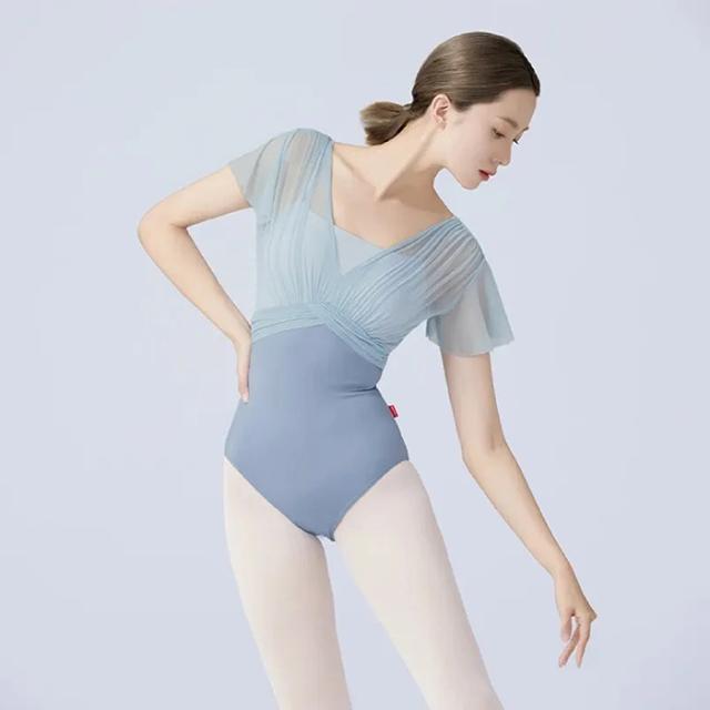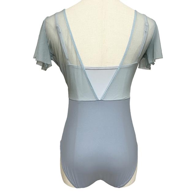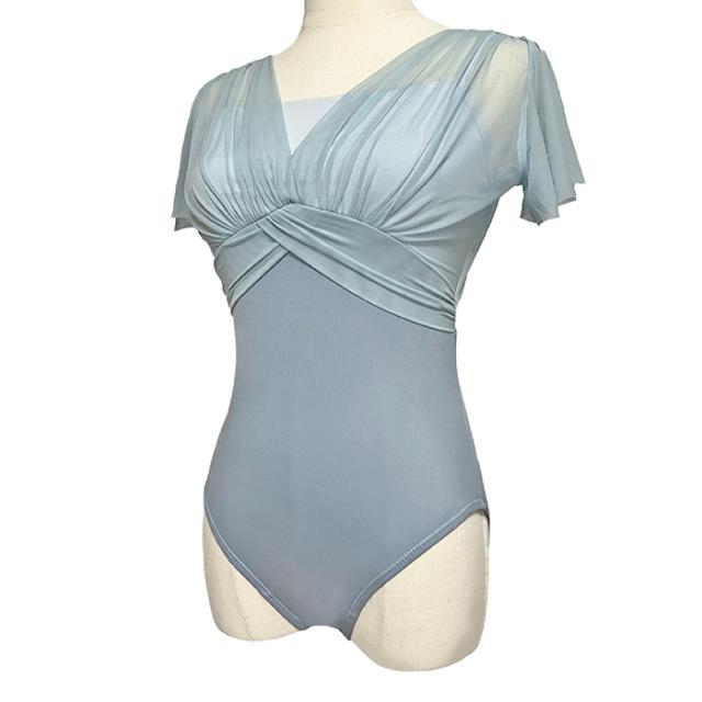 胸元のメッシュギャザーがエレガントな、半袖のレオタードです。
