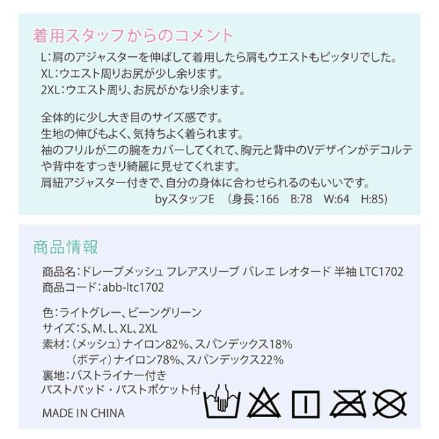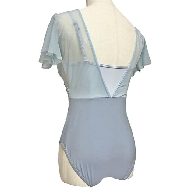 バレエ レオタード ドレープメッシュ フレアスリーブ 半袖 LTC1702 バストパッド付・バストポケット付 ジュニア・大人 半袖 メッシュ 細見え 二の腕 高身長 おしゃれ ストレッチ 伸縮 レッスン 練習 着 ブルー 水色 グレー グリーン 緑 150 155 160 165 170 175 180