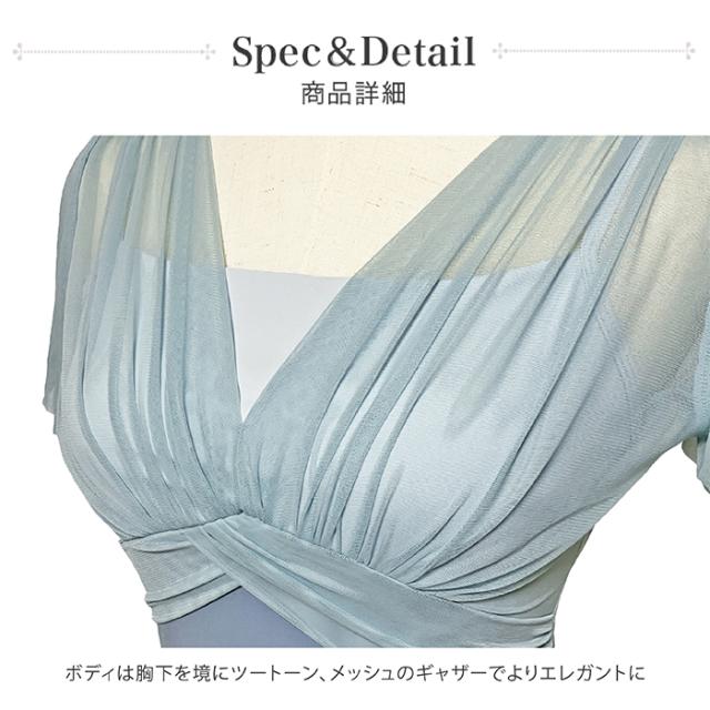 デコルテと背中のメッシュ部分はVラインになっており、縦長のシルエットを演出します。