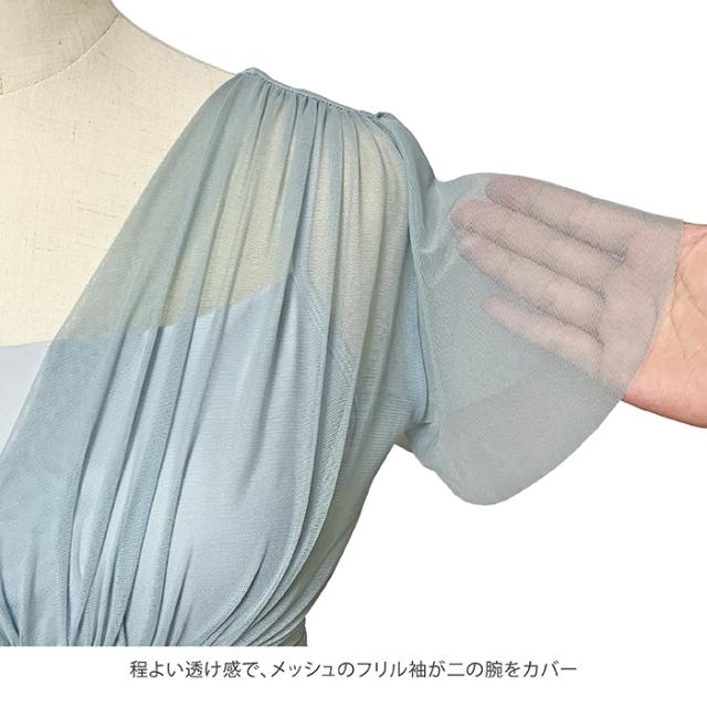 透け感あるメッシュで肩・袖周りから背中をすっきり見せてくれます。ギャザーメッシュが上品♪ 嬉しい二の腕カバー&ハイウエスト スタイルアップ おとな デザイン
