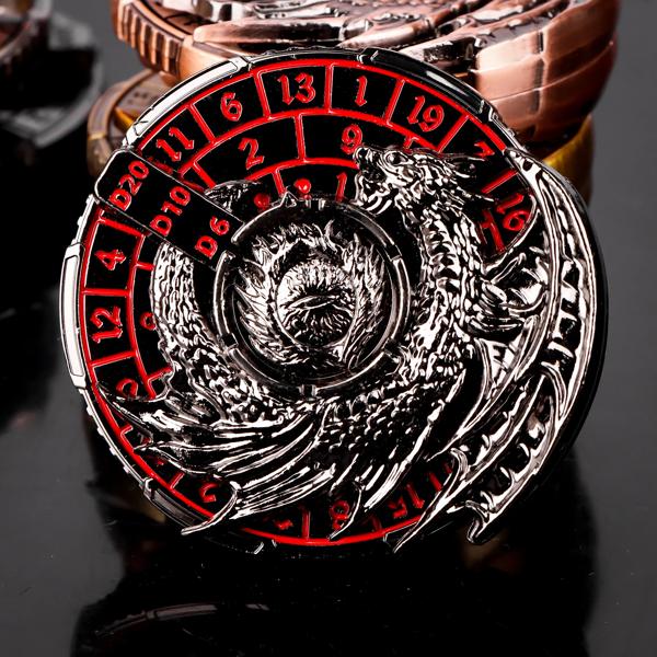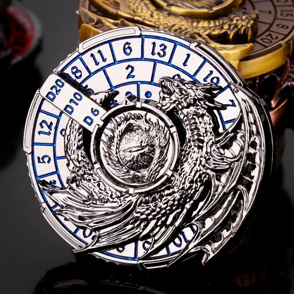 ??スピナーは3つの強力なドラゴンで飾られており、それぞれがd20、d10、d8、d12、d6、d4の異なるセットを表します。??