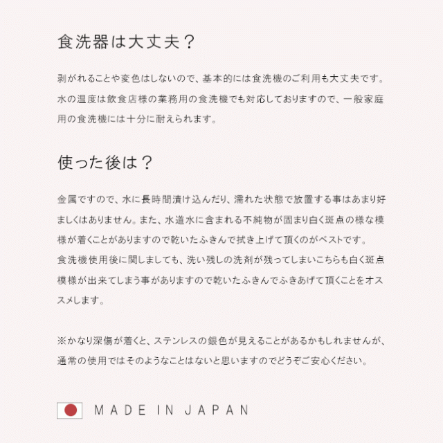 | 備考 | 食洗機に関しては水の温度は飲食店様の業務用の食洗機でも対応しておりますので、一般家庭用の食洗機には十分に耐えられます。 使用していくうちに小傷が付くことはありますが、そちらは経年変化としてお楽しみ下さい。 金属ですので、水に長時間漬け込んだり、濡れた状態で放置する事はあまり好ましくはありません。 また、水道水に含まれる不純物が固まり白く斑点の様な模様が着くことがありますので乾いたふきんで拭き上げて頂くのがベストです。 食洗機使用後に関しましても、洗い残しの洗剤が残ってしまい、こちらも白く斑点模様が出来てしまう事がありますので乾いたふきんでふきあげて頂くことをオススメします。 ※かなり深傷が着くと、ステンレスの銀色が見えることがあるかもしれませんが、通常の使用ではそのようなことはないと思いますのでどうぞご安心ください。 |