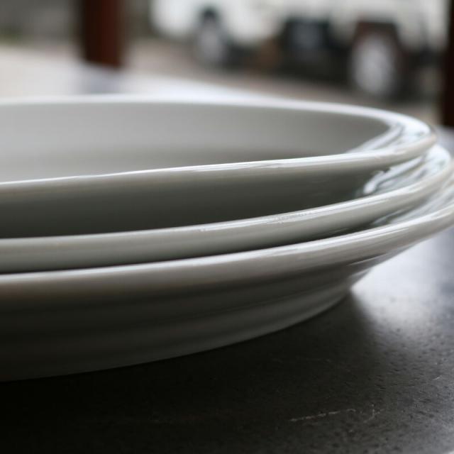 幅広いリムの立ち上がりがプレートに程よい深さを持たせ、何を盛り付けても様になる定番中の定番。
