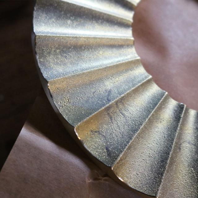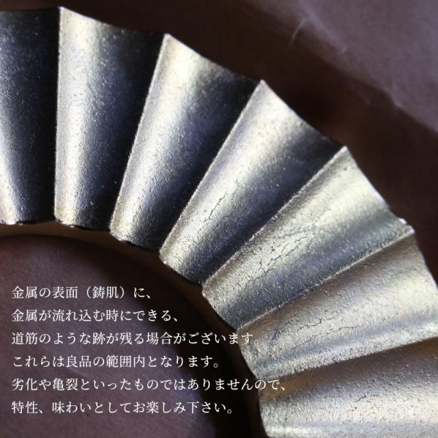 ・本製品はメッキや塗装などをしない『無垢の真鍮』で作られています。最初はピカピカとしていますが、使い込んで行くうちに、徐々に色合いが濃くなってきます。そして使えば使うほど、表面が酸化して独特の味わいが出てきます。使い込むことで、素材本来の美しさが増してきます。 ・元の輝きを取り戻すためには、市販の金属研磨剤(メタルポリッシュ等)や磨き布などで磨けば、元の輝きを取り戻すことができます。 ・本製品は砂型鋳物で作られていますので砂型の『鋳肌』がでています。真鍮鋳肌独特の砂目、色合い、擦れ具合などは『無垢の真鍮』の証です。素材そのものの味わいをお楽しみください。