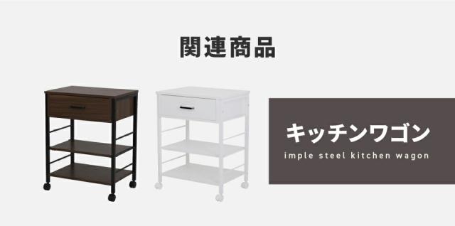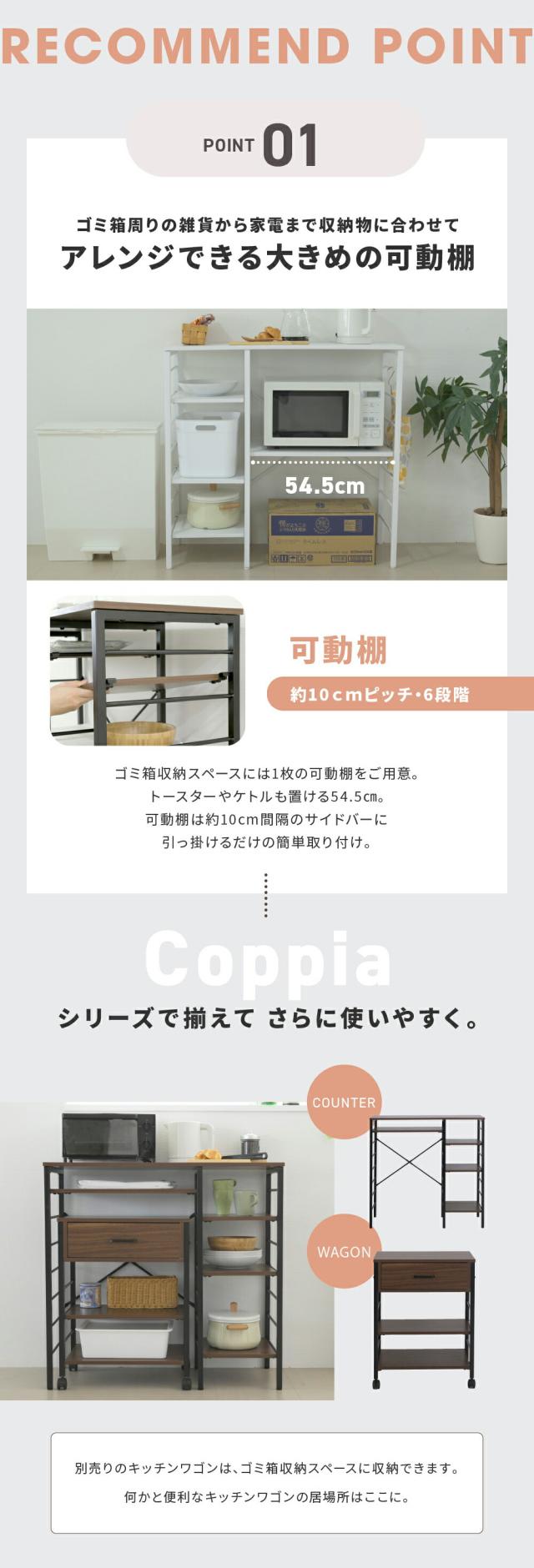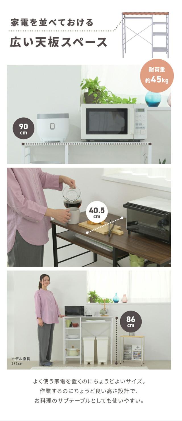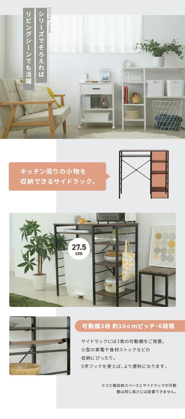 幅90cmの広々作業スペースとゴミ箱収納ができるキッチンカウンター。奥行き40cmなので、大きめの電子レンジなど置くこともできます。サイドの収納スペースは可動棚なので、収納するものに合わせて高さ調整が可能なラック。サイドフレームにはS字フックなどを使うことで、ちょこっと掛けにご活用いただけます。