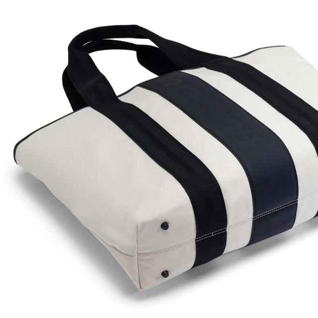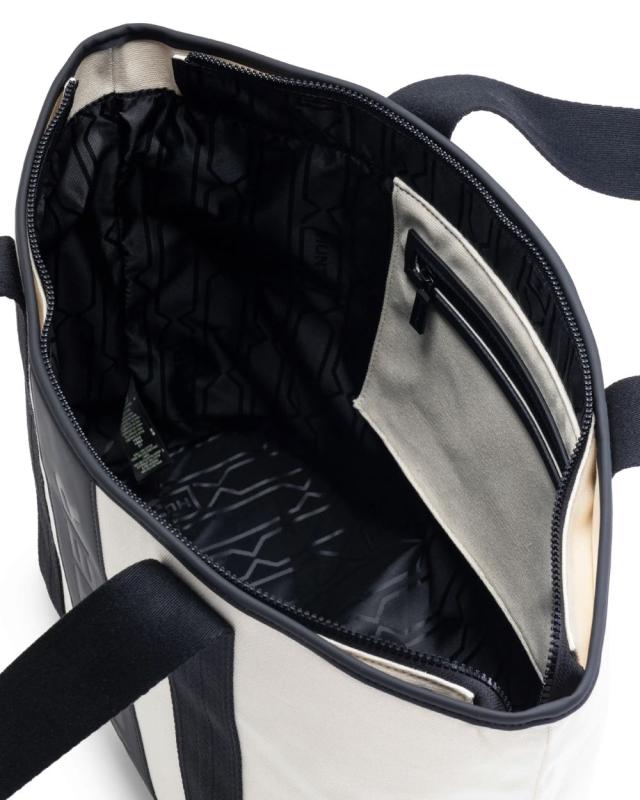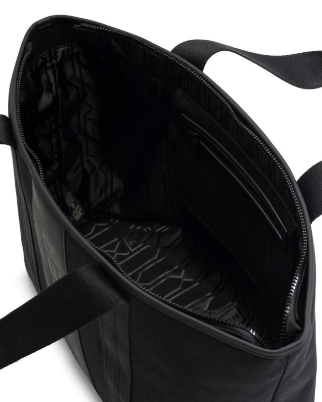 バッグの持ち手はラバー加工を施した100% ポリウレタンで、ハンターブランドのデボス加工が施されています。裏地は100%リサイクルポリエステル素材で、内側に小さな貴重品を入れるのに便利なジップポケットと、底の汚れ防止のためバックの底の四角に底鋲が付いています。