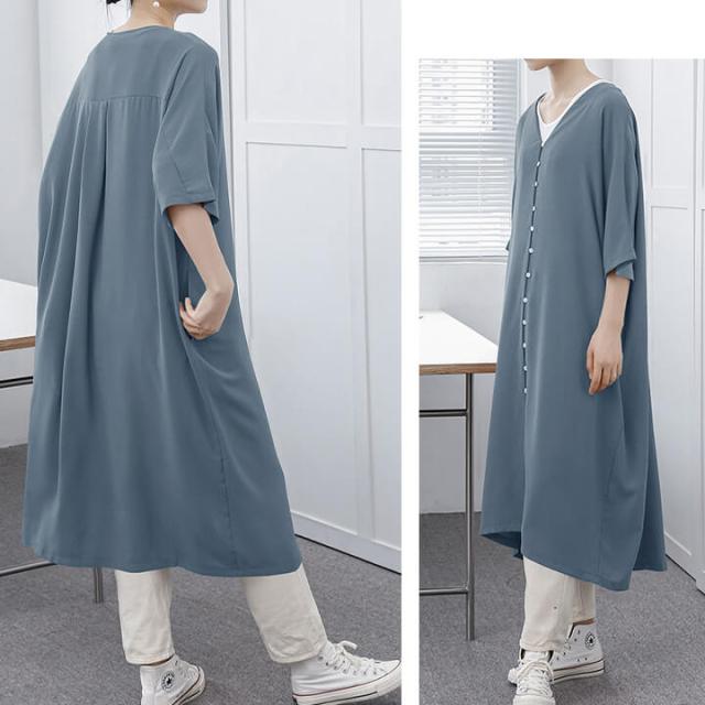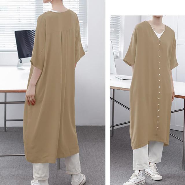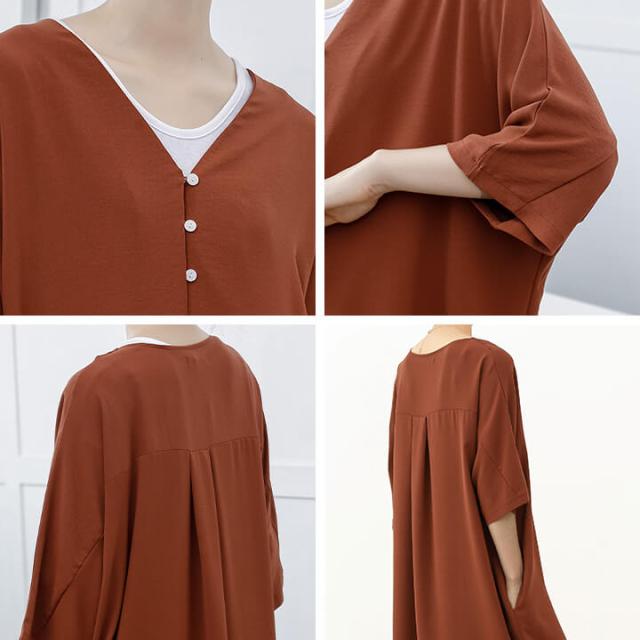 シャツワンピース 春 夏 秋 大きいサイズ ロング マキシ丈 レディース シャツワンピ ワンピース Vネック きれいめ 半袖 おしゃれ 可愛い カジュアル シンプル 大きめ ゆったり すっきり レイヤード 着回し力 膝下丈 体型カバー 大人 ママ 20代 30代 40代 50代