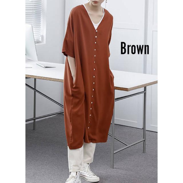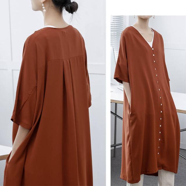 シャツワンピース 春 夏 秋 大きいサイズ ロング マキシ丈 レディース シャツワンピ ワンピース Vネック きれいめ 半袖 おしゃれ 可愛い カジュアル シンプル 大きめ ゆったり すっきり レイヤード 着回し力 膝下丈 体型カバー 大人 ママ 20代 30代 40代 50代 ギフト オーバーサイズ 普段使い 低身長 ドレープ 落ち感 M L 9号 11号 ベージュ 肌色 ブラック 黒 ブルーグレー 青灰 ブラウン 茶色 オレンジ 橙色 rt9121