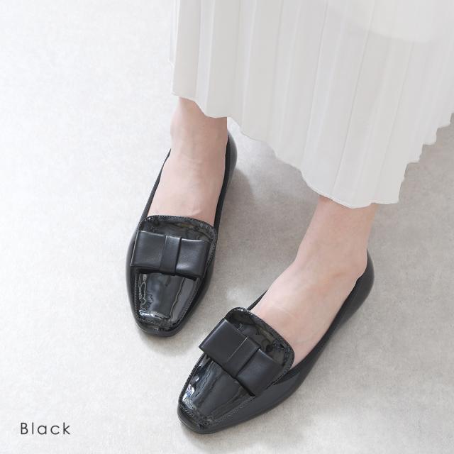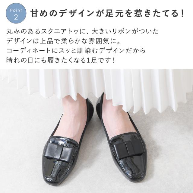 スクエアトゥに、大きいリボンがついたデザインは上品で柔らかな雰囲気に。