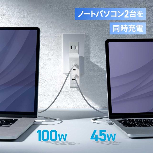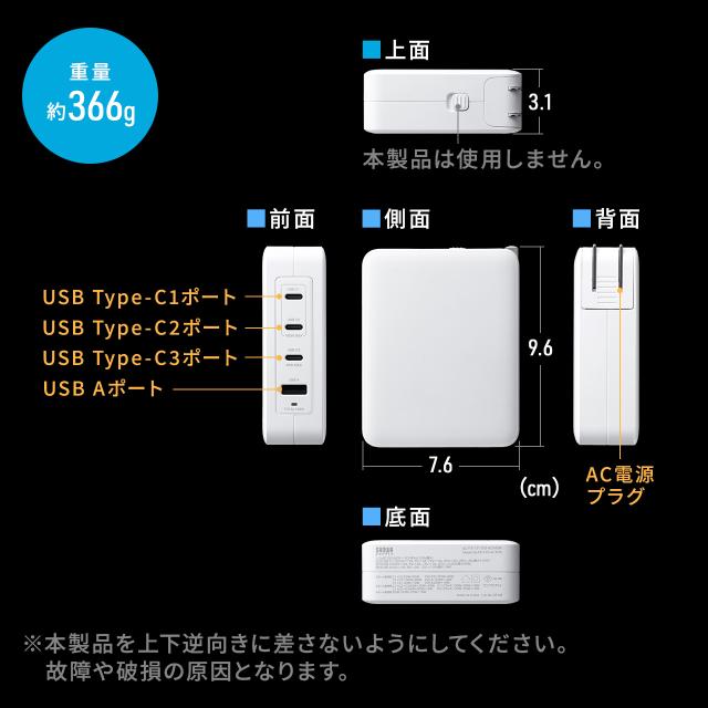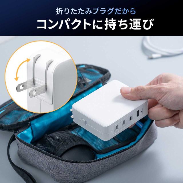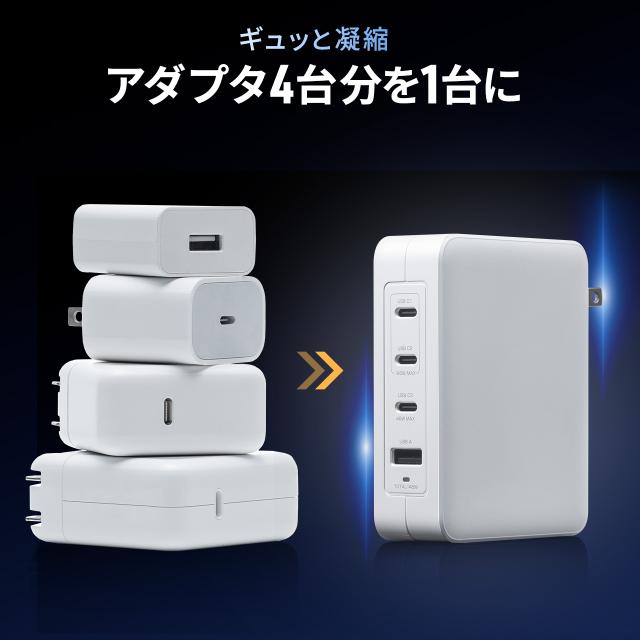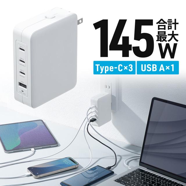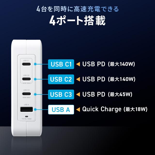 USB充電器 PD 合計最大145W 4ポート 1ポート最大140W Type-C×3 USB-A×1 GaN採用 折りたたみ式プラグ 急速充電 ノートパソコン 複数ポート PSE適合商品 ホワイト[700-AC045W]