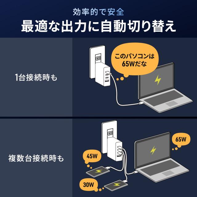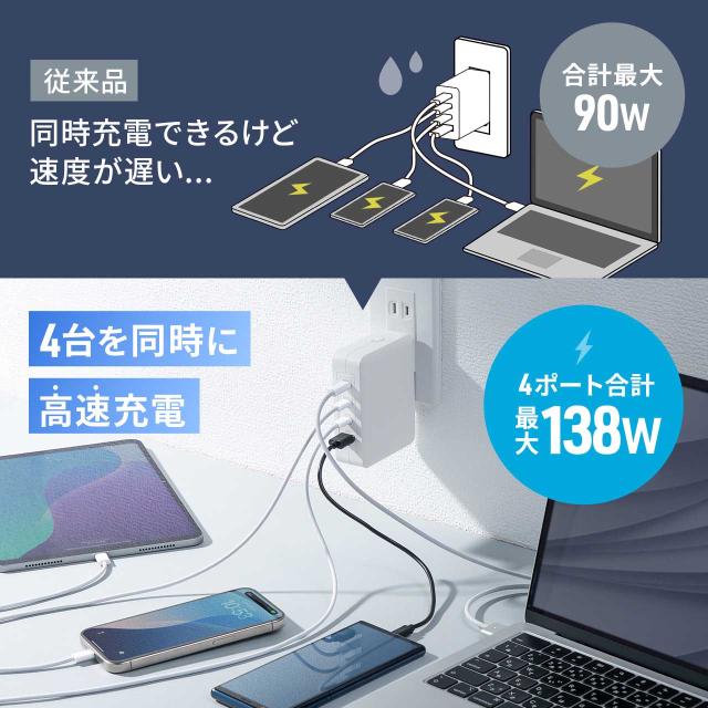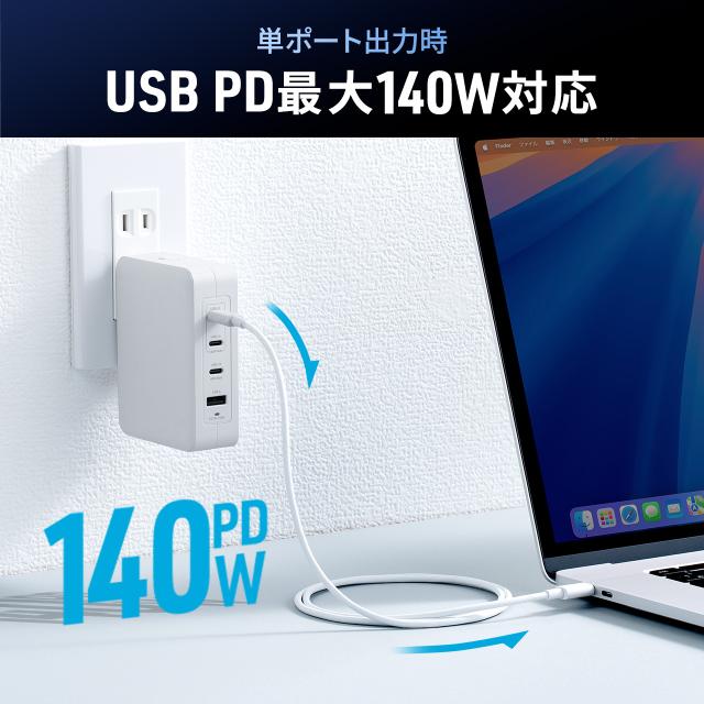 ●1台でノートパソコンからタブレット・スマートフォンまであらゆるデバイスの充電に対応できる高出力・マルチポート仕様のUSB充電器です。●1ポート使用時は最大140WまでのUSB PD規格による充電に対応し、一般的なノートパソコンをはじめ、高い電力を必要するハイスペックノートパソコンやMacBook Pro 16インチも可能です。