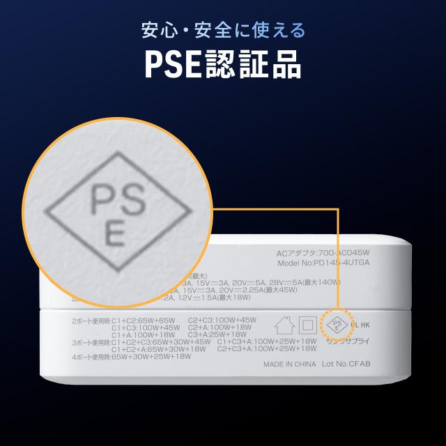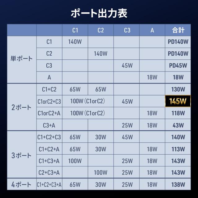 ●USB Type-Cを3ポートとUSB-Aを1ポート搭載した合計4ポート仕様で、複数ポート使用時も合計で最大145Wまでの出力に対応するので、幅広い機器の充電に対応し、最大4台の機器を同時に充電することができます。