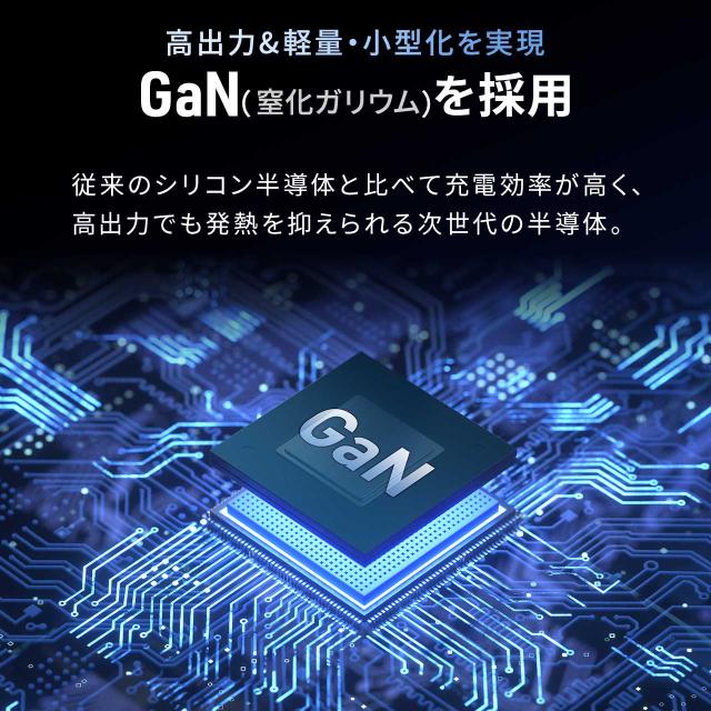 ●従来のシリコン技術に代えて、効率的で発熱が少ないGaN(窒化ガリウム)技術を搭載し、高出力でありながらスリムかつ小型設計を実現しています。