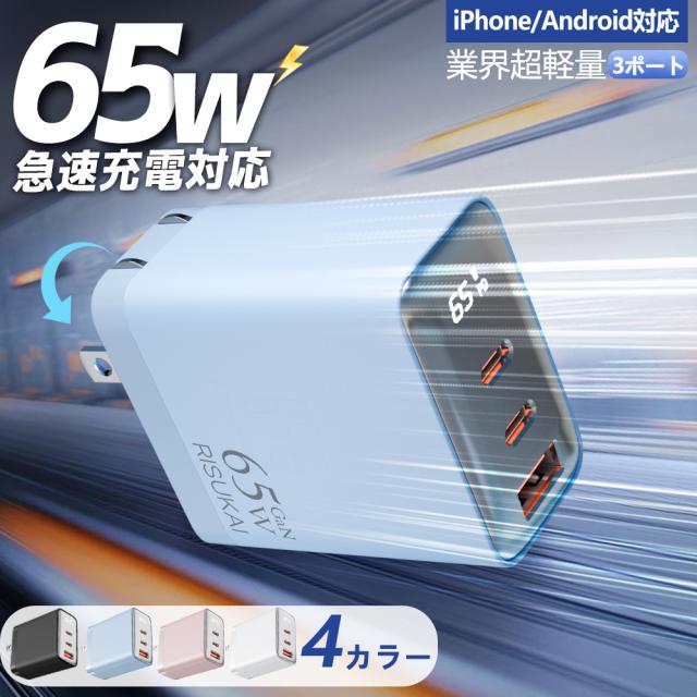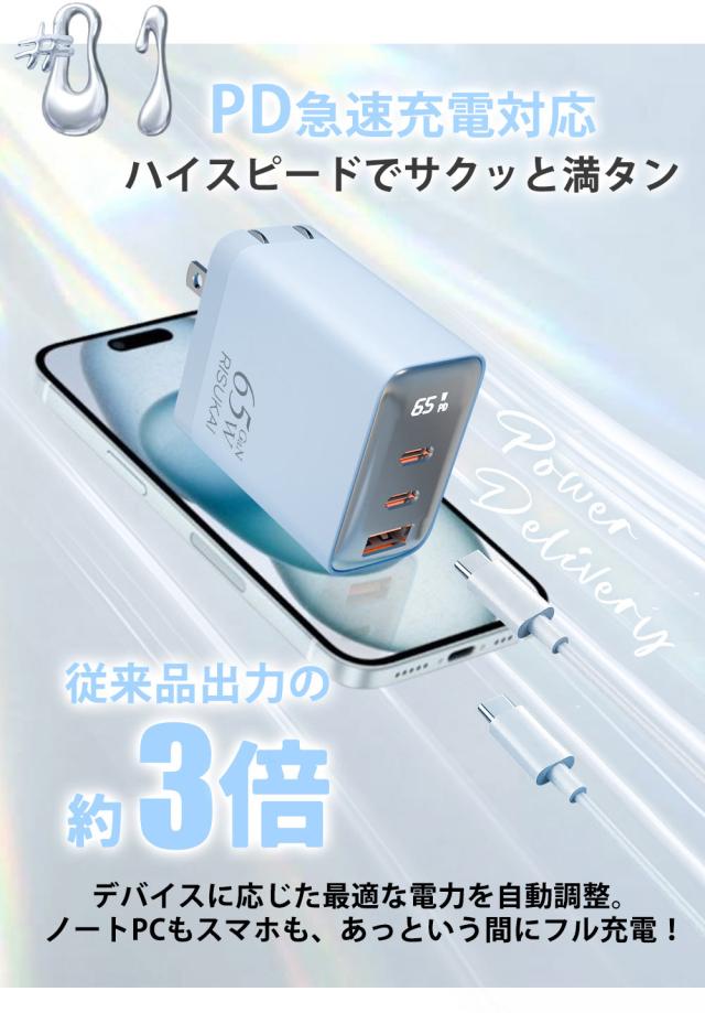 【旅行・出張に最適!】充電器 iPhone 折りたたみプラグ 65w 急速充電器 スマホ充電器 3ポート 同時に充電 USB充電器 Android充電器 PD充電器 充電器タイプC ACアダプター 電源アダプター QC3.0 超小型 軽量 PSE認証済み