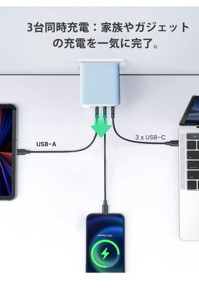 USB-C×2 & USB-A×1の合計3ポートを搭載し、複数デバイスを同時充電可能!