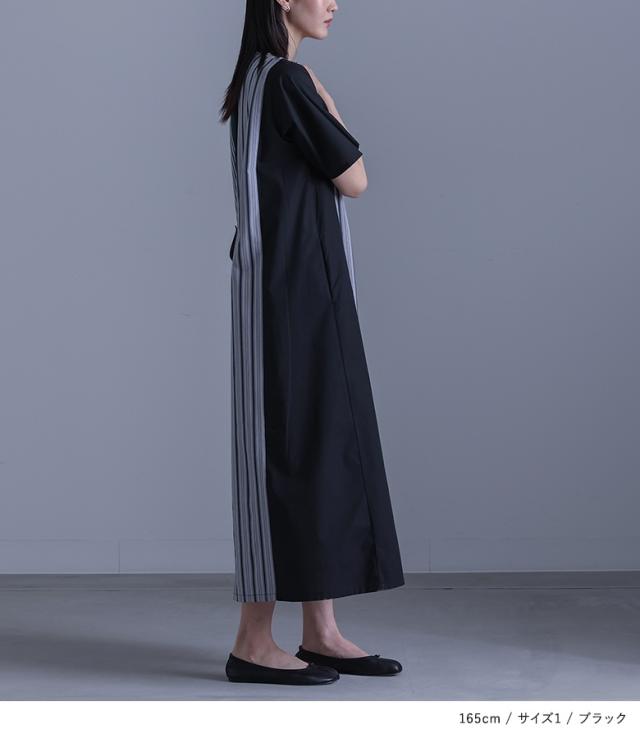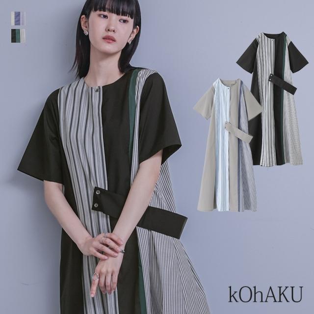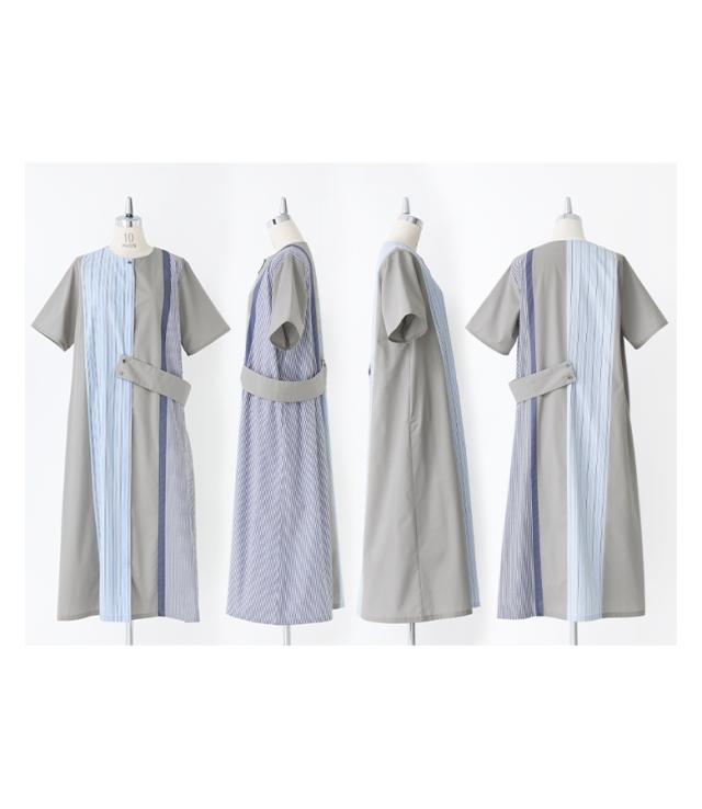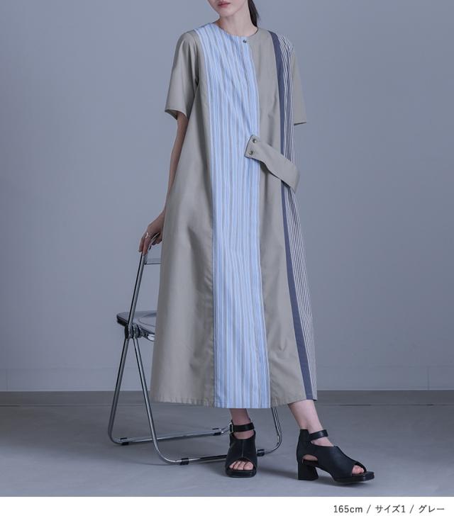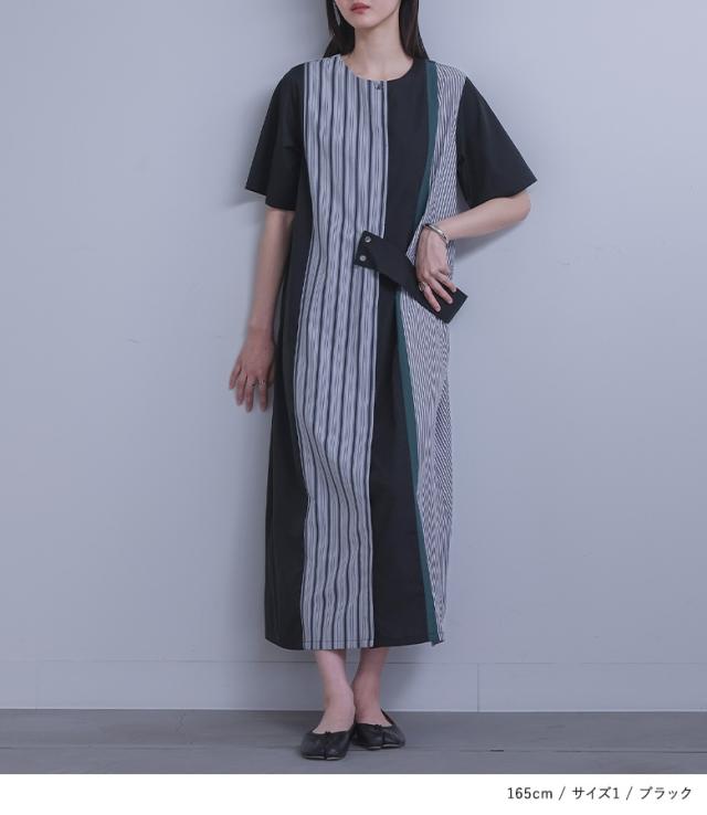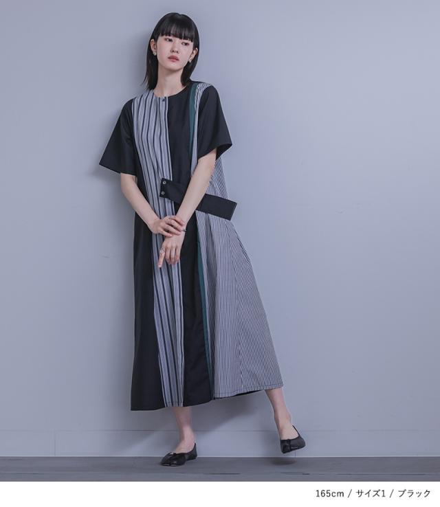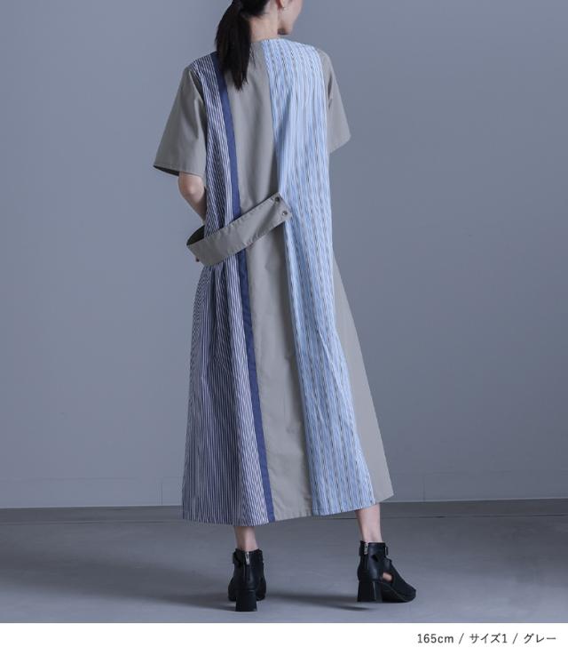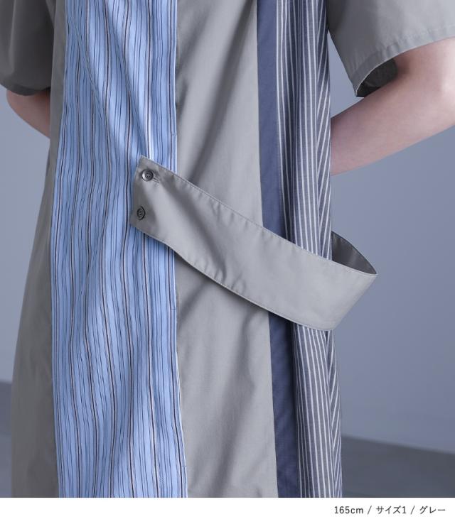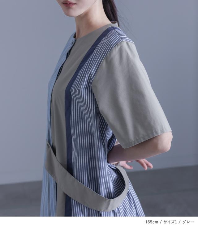 『無地×ストライプ切替ワンピース』※メール便可※【10】[ワンピース レディース ドレス ロング丈 半袖 無地 ストライプ柄 ベルトデザイン シャツ生地 体型カバー ロングワンピ 春 夏]