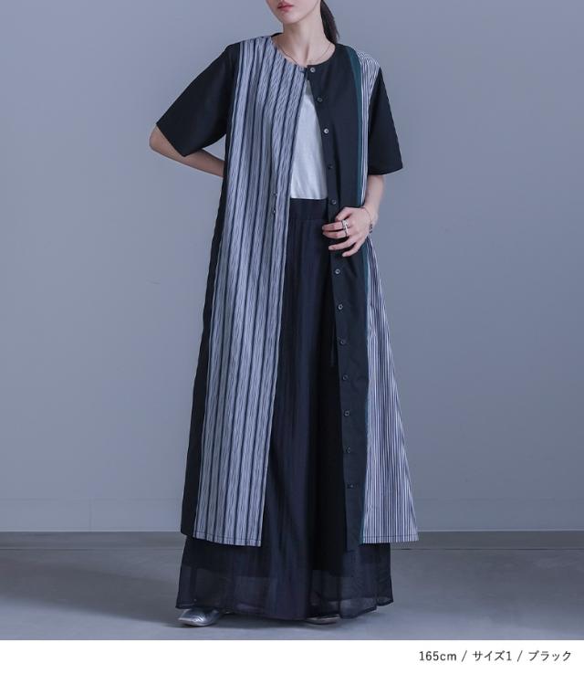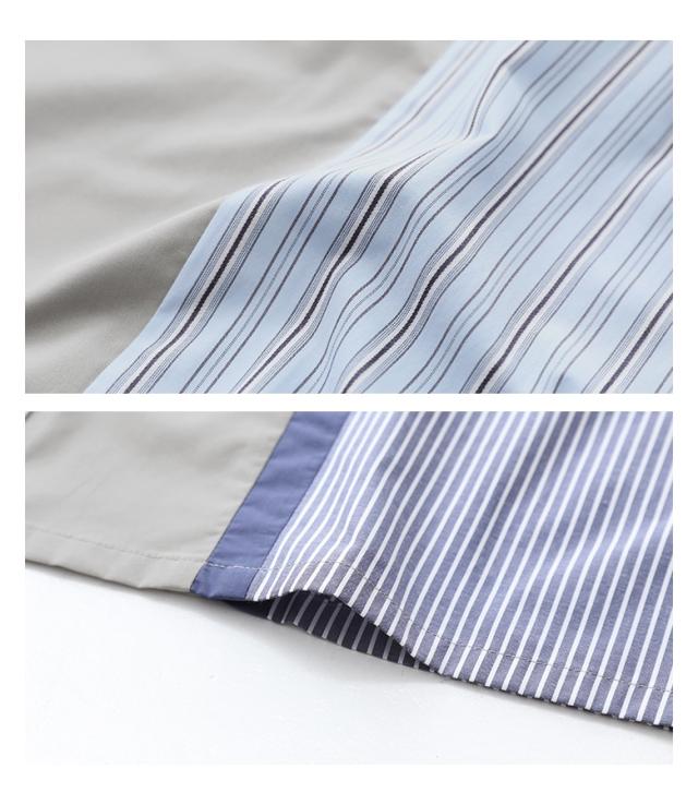 ■デザイン 二種類の異なるストライプ生地と無地の生地を切り替えたワンピース。左側に太めのベルトを付け、高級感とデザイン性をプラスしています。ベルトは取り外しが可能で、前を開けると羽織としても着用でき、気分に合わせて印象を変えることができます。 ■コーディネート 一枚で主役級のワンピースなので、着るだけでコーディネートがお洒落に決まるアイテム。ベルトを外して前を開けると、羽織としても着用いただくことができるので、一枚でコーデの幅が広がります。 ■素材 さらりとした肌触りで程良い厚みのシャツ生地を使用。コットン混で快適にご着用いただけます。 |
