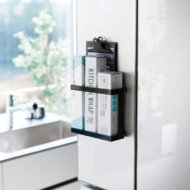 ●ガラスドアの冷蔵庫やキッチンシンク扉にフィルムフックで簡単に取り付けできるラップホルダー。