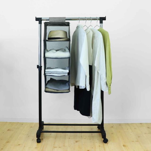 ハンガーラックやクローゼットの空きスペースを有効活用できるハンギングラックです。横幅27cmのゆったり設計で、畳んだ衣類をスッキリ収納できます。帽子や厚手の冬物セーターなど、高さのあるアイテムもラクに収納できます。