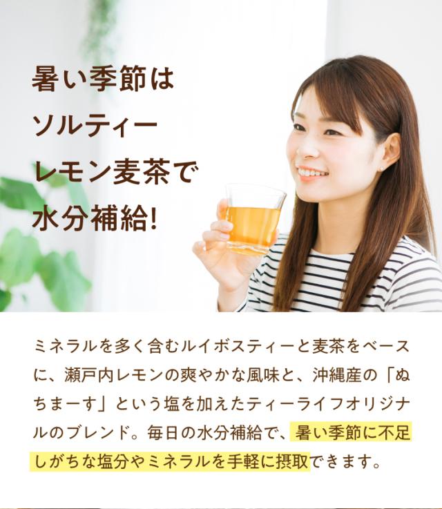 ミネラルを多く含むルイボスティーと麦茶をベースに、瀬戸内レモンの爽やかな風味と、沖縄産の「ぬちまーす」という塩を加えたティーライフオリジナルブレンド!毎日の水分補給で、暑い季節に不足しがちな塩分やミネラルを手軽に摂取できます♪