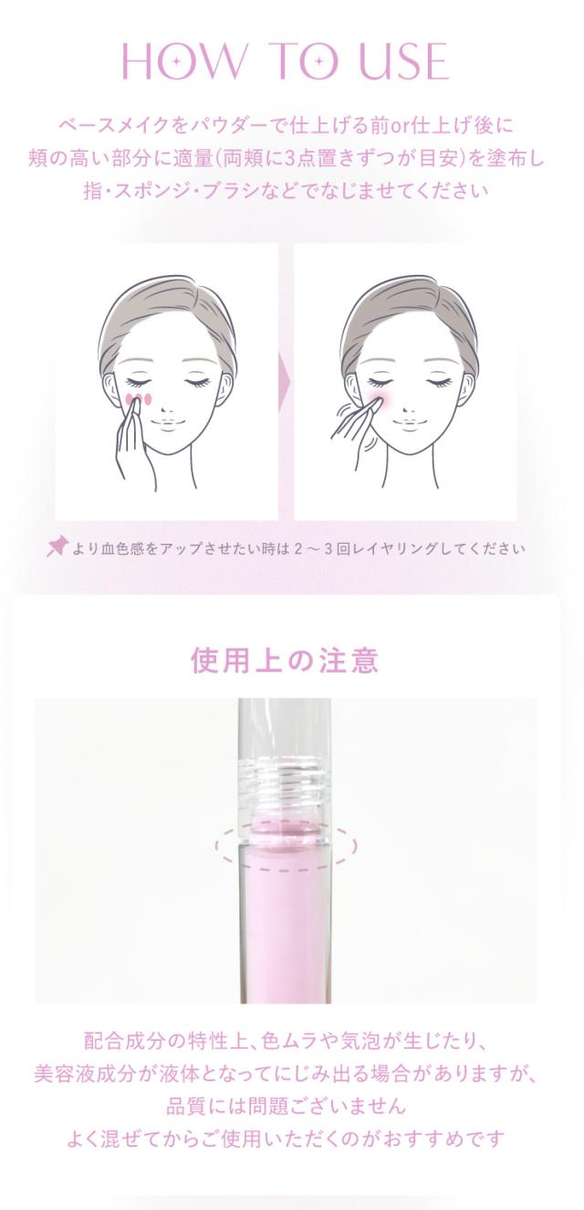 よく混ぜてからご使用ください。頬の高い部分に適量をのせて、指・スポンジ・ブラシなどでなじませてください。