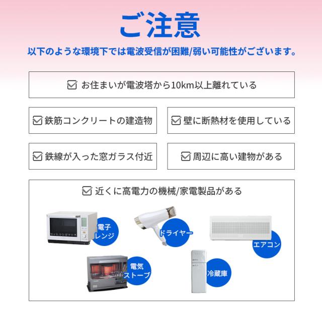 受信感度が弱い場合は、アンテナを窓際や高い位置に置いて再度お試しください。