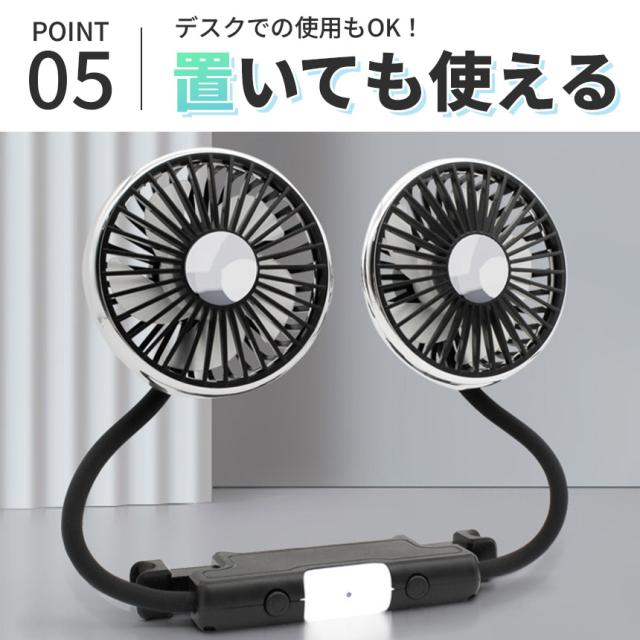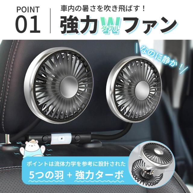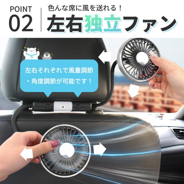 \左右独立タイプの車載扇風機/シリコン素材のアームで角度、向きを自由に調節可能!ツインヘッドで左右それぞれで風量の調節もできるので、片方は後部座席、片方は運転席方向に向けるなど、用途によって柔軟に使用できます!