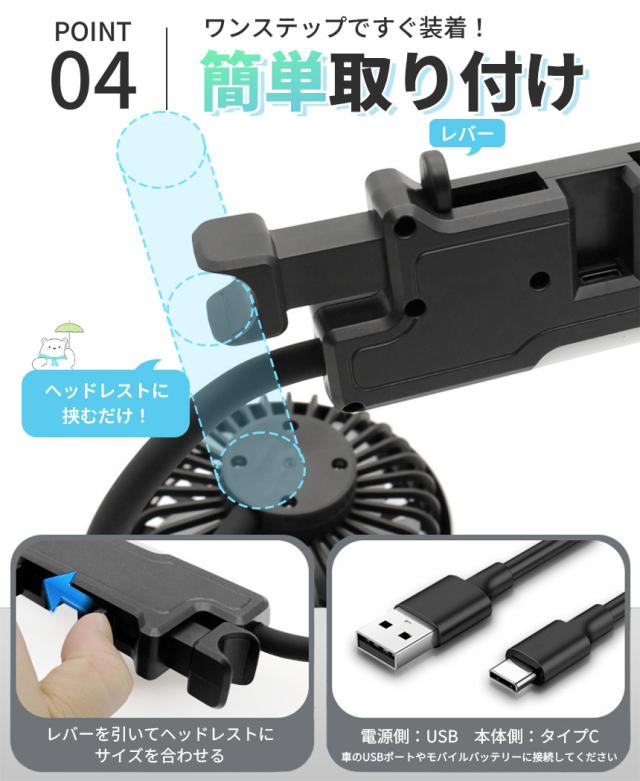 ツインヘッドで左右それぞれで風量の調節もできるので、片方は後部座席、片方は運転席方向に向けるなど、用途によって柔軟に使用できます!