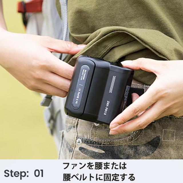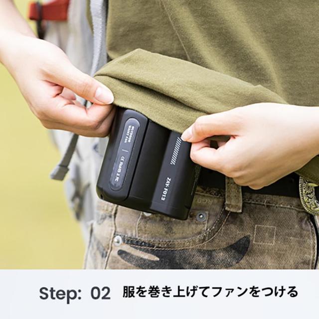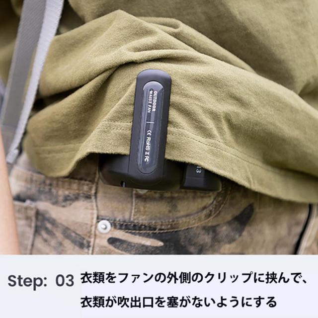 ベルトに取付けてシャツの裾をクリップで挟んだら、服内に風を送り込めます。