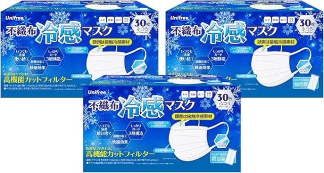 冷感マスク まとめ買い 個包装 30枚 ウイルス 花粉 乾燥対策秋用マスク 秋冬マスク 立体タイプ 快適マスク 快適呼吸 蒸れにくい 不織布マスク ふつう 小さめ 大人 子供用 接触冷感 使い捨て ひんやりマスク やわらか耳紐 学級閉鎖 感染Unifree ユニフリー
