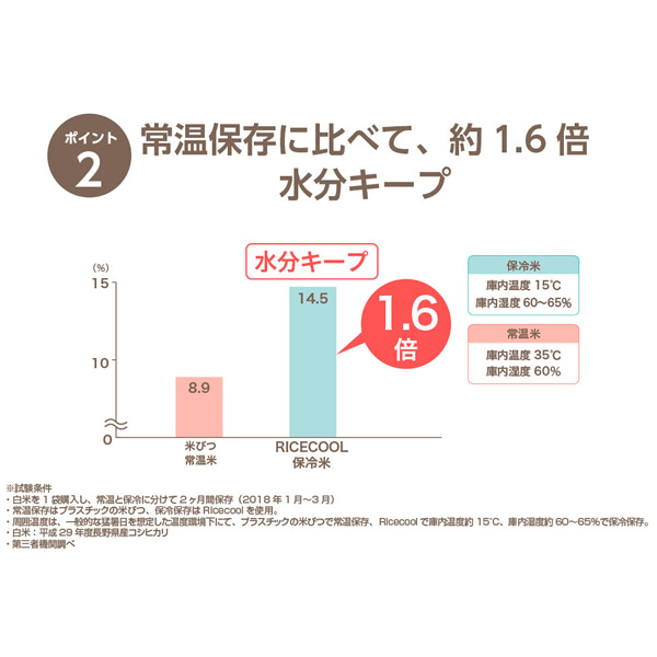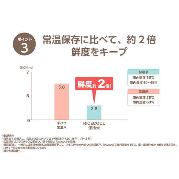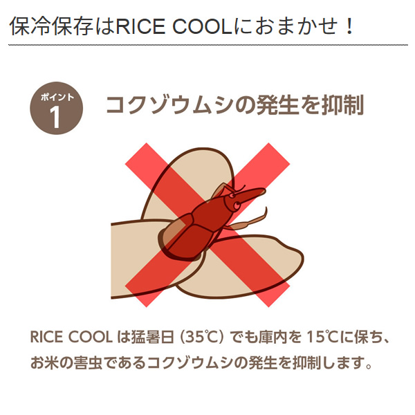 猛暑日(ライスクールの周囲温度35℃)でも、庫内をお米の保管に最適な温度と湿度に保ち、酸化や害虫・カビの発生、長期保存による古米臭からお米をしっかり守ります。