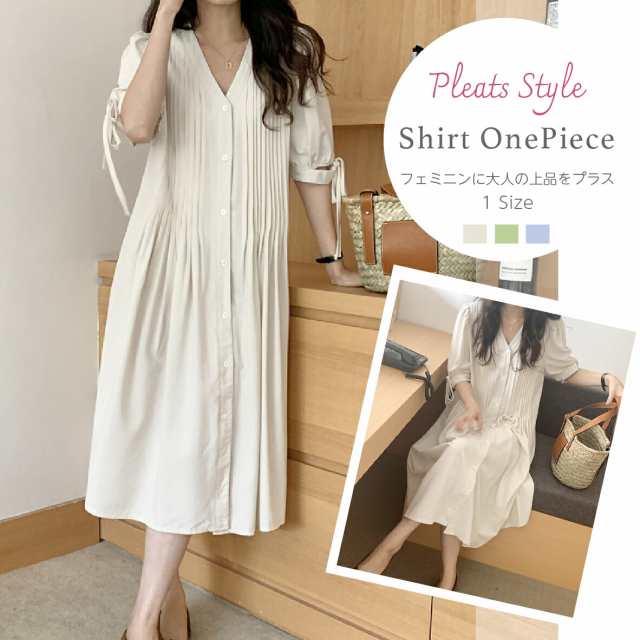 レディースピンタックシャツワンピース レディースワンピース ワンピース レディース シャツワンピース サンドレス ピンタック 袖リボン 綿混紡 Vネック 半袖 ひざ下丈 足首見える丈 ナチュラル 春夏 春 夏 送料無料