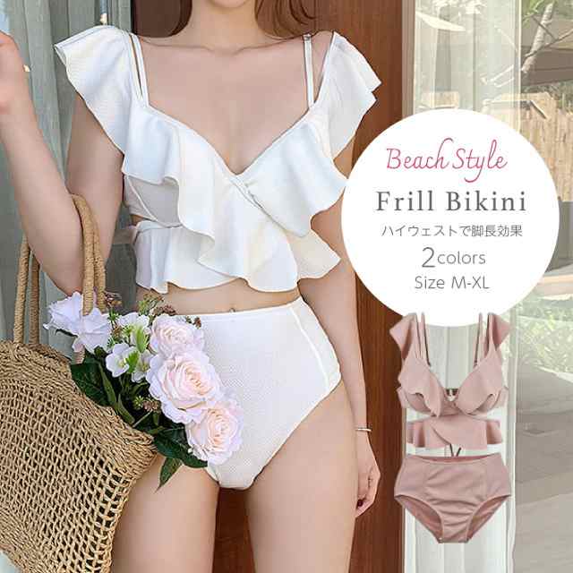 韓国 ハイウエスト 三角スプリット 水着 フロントクロス ピンク セクシー オフショルダー 流行 着痩せ フリル 切り替え ビキニ フリルビキニ