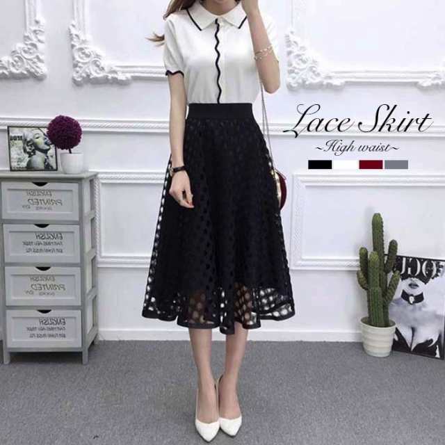 レーススカート ひざ丈 ミモレ丈 刺繍 ミディアム レース シースルー ハイウエスト Aライン 水玉 ドット 可愛い お洒落 フリーサイズ