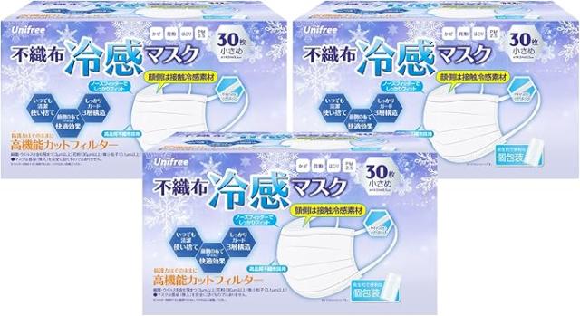 冷感マスク小さめ まとめ買い お得 個包装 30枚入x3箱(90枚) 夏用 大人 子供 接触冷感 不織布 マスク 冷感 ひんやりマスク プリーツマスク 使い捨て 3層マスク 飛沫防止 ウイルス PM2.5 花粉対策 抗菌通気 やわらか耳紐【送料無料 Unifree ユニフリー】