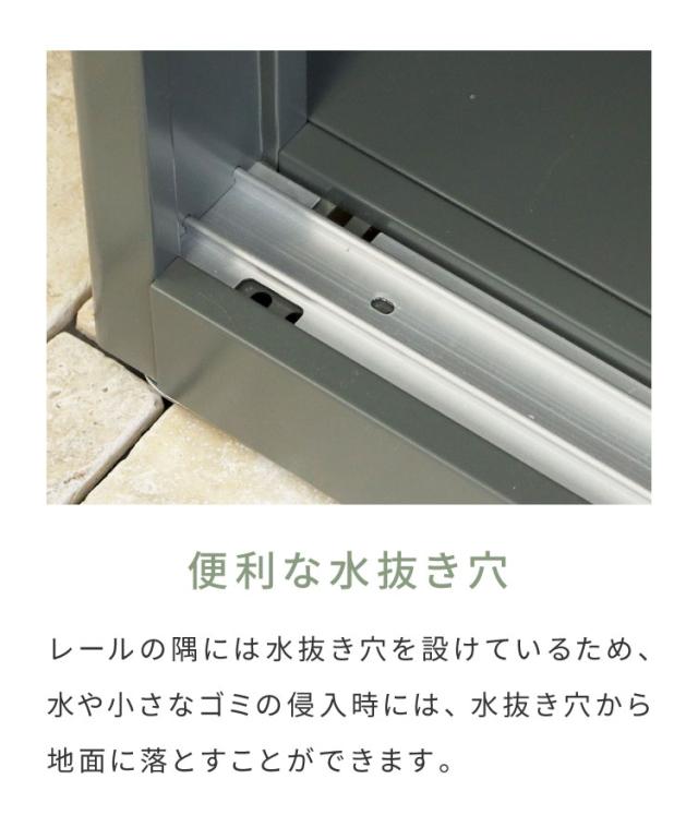 レールの隅には水抜き穴を設けており、水や小さなゴミの侵入時には水抜き穴より地面に落とすことが出来ます。