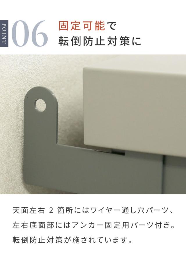 天面左右2箇所にはワイヤー通し穴パーツが、左右底面部にはアンカー固定用パーツが付属しており、転倒防止対策が施されています。