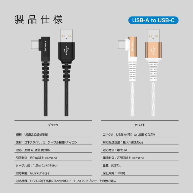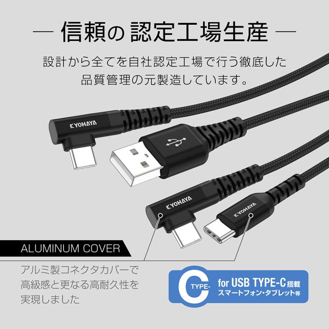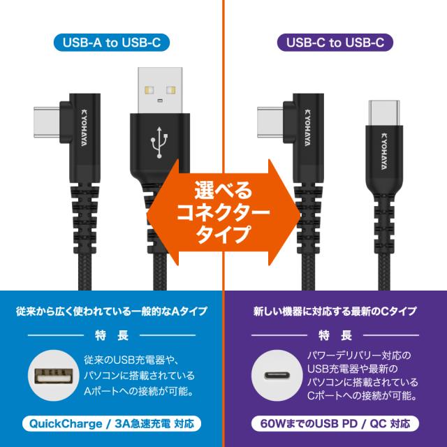 | 商品名 | USB Type-C ケーブル L型コネクタ 急速充電 PD QC 対応 A to C / C to C 選べるコネクター 1.2m KYOHAYA JKLS |