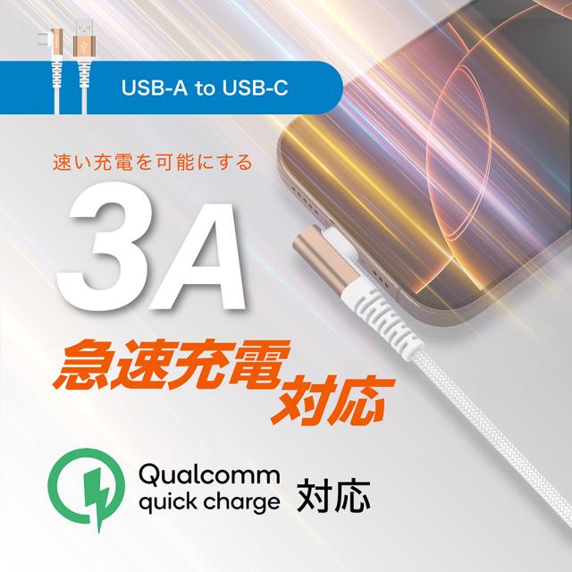 | USB TYPE-A TO USB TYPE-Cケーブルは3A急速充電対応 |