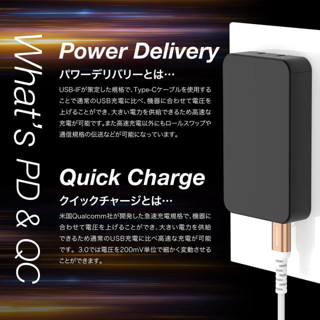 | PD(POWER DELIVERY)とQC(QUICK CHARGE)に両対応し、対応したUSB-Cポート搭載充電器と合わせて使用することで、最大出力60W(20V/3A)の急速充電機能でノートPCを充電、またスマートフォンを約30分で最大50%までの充電が可能です。