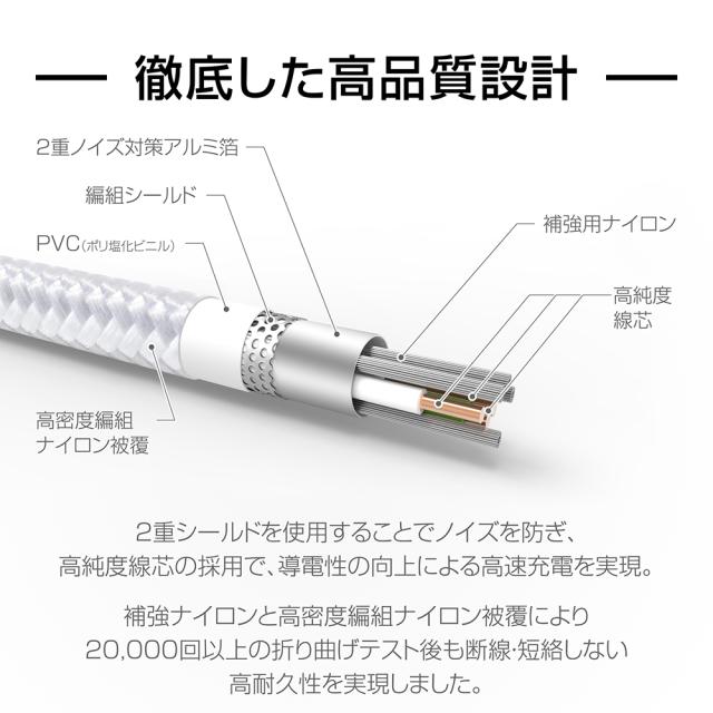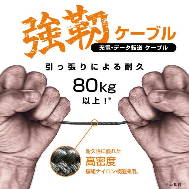 | 断線に強い強靭タイプの高密度ナイロン網組被覆を採用することにより、ケーブルの強さと柔らかさを両立し、引っ張りによる耐久80KG以上と、高耐久性を実現した、 USB TYPE-C ケーブルです。(当社調べ)