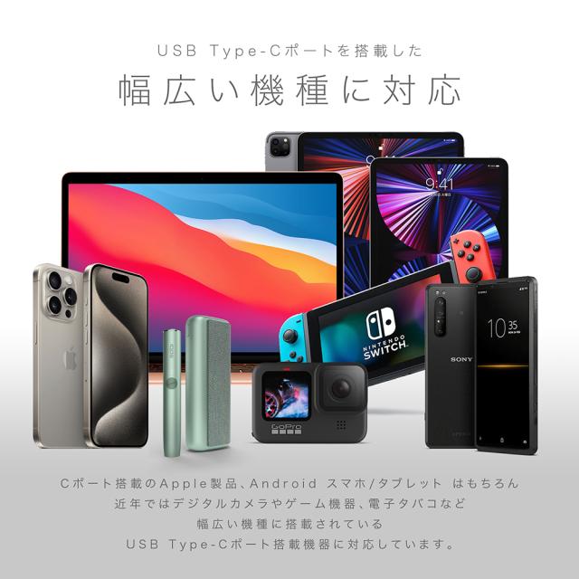 | Type-C to Type-C 対応機種 | USB-C端子搭載のパソコン、iPhoneシリーズ、iPad Pro、iPad mini、Androidスマートフォン、タブレット、その他の端末 |