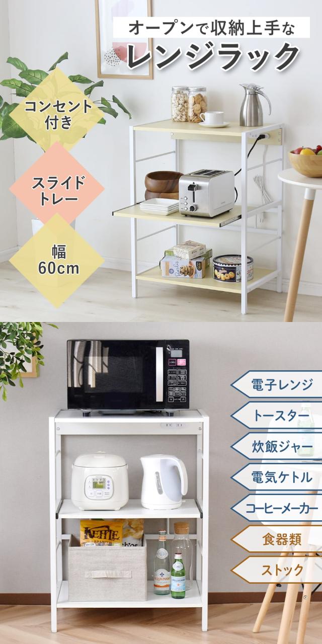 幅60cm・高さ83cmのスリム設計ながら、キッチン家電を一か所にまとめて収納可能。コンセント付きなので複数の家電を移動させずに使用することもできます。中段にはスライドトレーを搭載し、炊飯器の蒸気逃しやポットの給水もラクラク。家電以外にも食器や食品ストック、キッチンツールなど、何かと“もの”が多いキッチンをスッキリと整理整頓できます。省スペースで機能的なキッチン収納をお探しの方におすすめのレンジラックです。