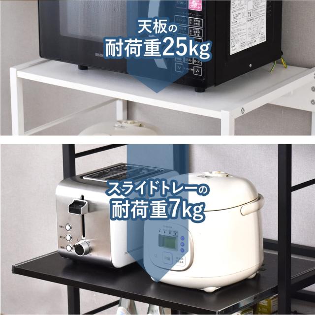 キッチン家電を複数台収納する際に気になるのが、棚の強度。このレンジラックは、しっかりとしたスチールフレームと頑丈な棚板を採用しており、天板・中段・スライド棚それぞれに十分な耐荷重を確保しています。電子レンジやトースターなど重さのある家電も安心して設置でき、さらに調味料や缶詰やペットボトルなどの食品ストックを収納してもたわみにくい構造です。