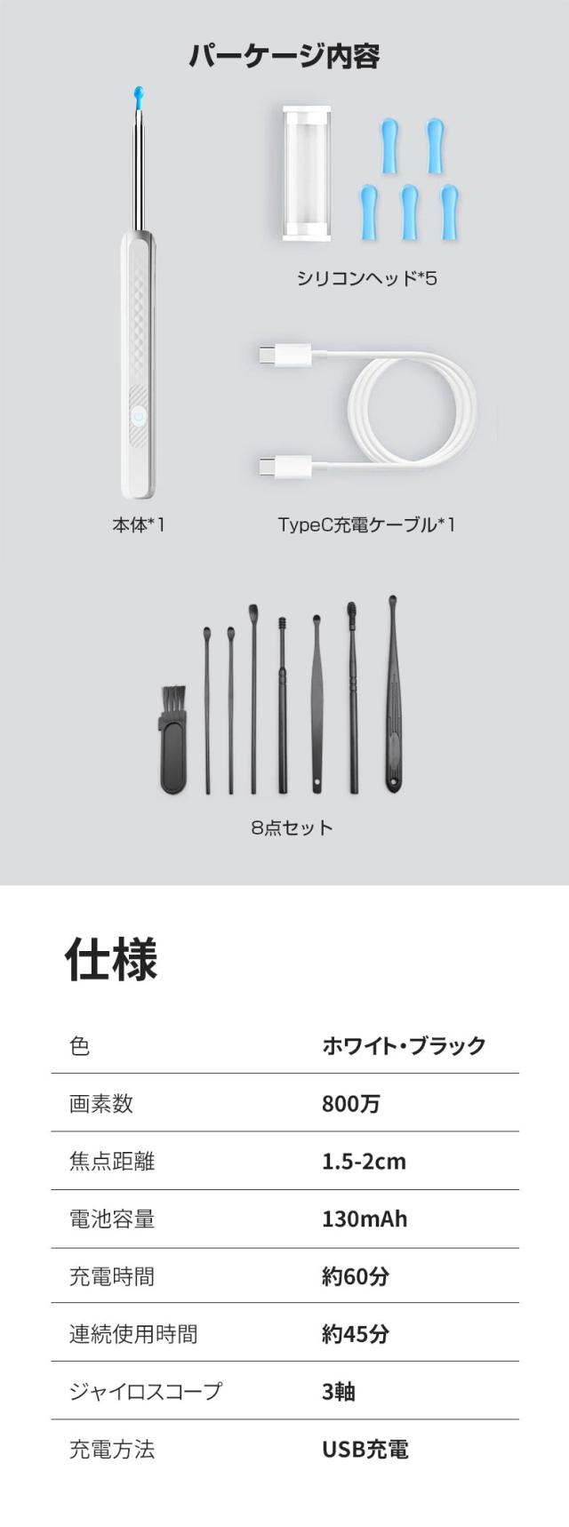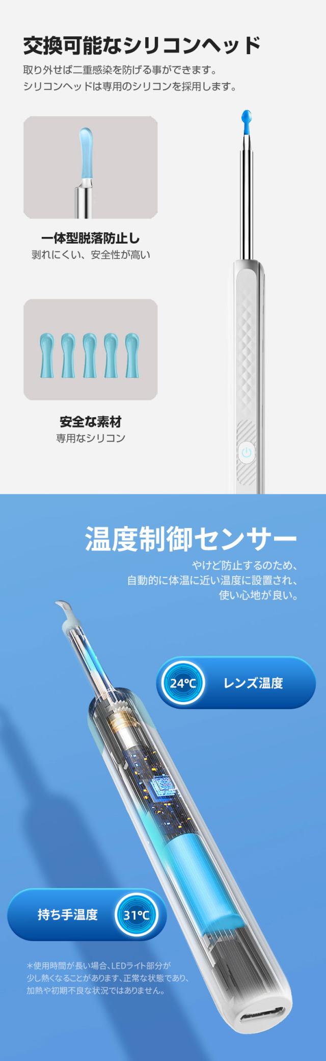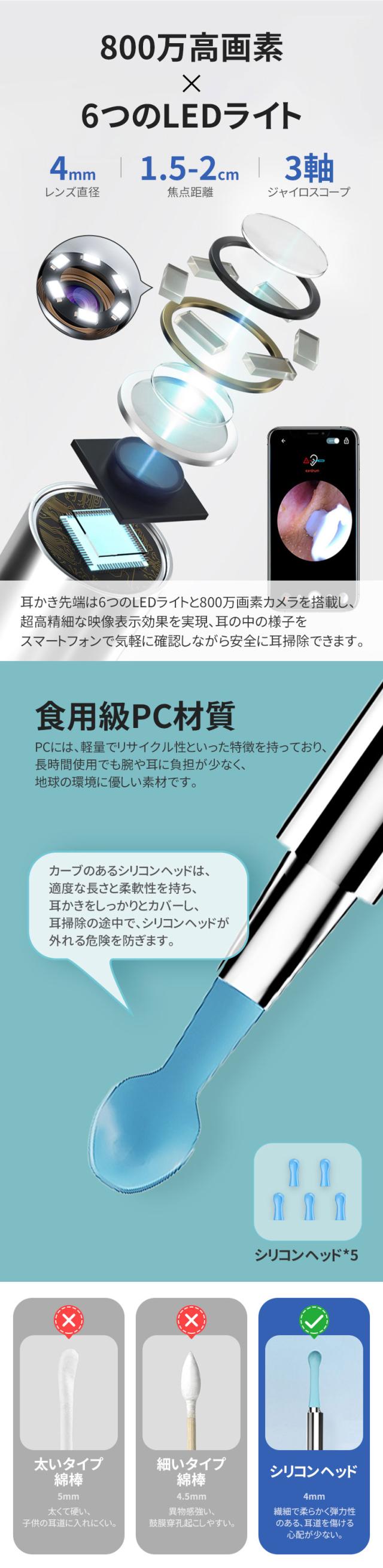 耳かき先端は6つのLEDライトと800万画素カメラを搭載し、超高精細な映像表示効果を実現、耳の中の様子をスマートフォンで気軽に確認しながら安全に耳掃除できます。
