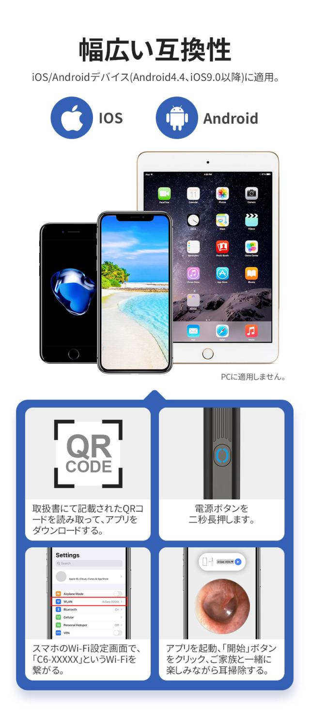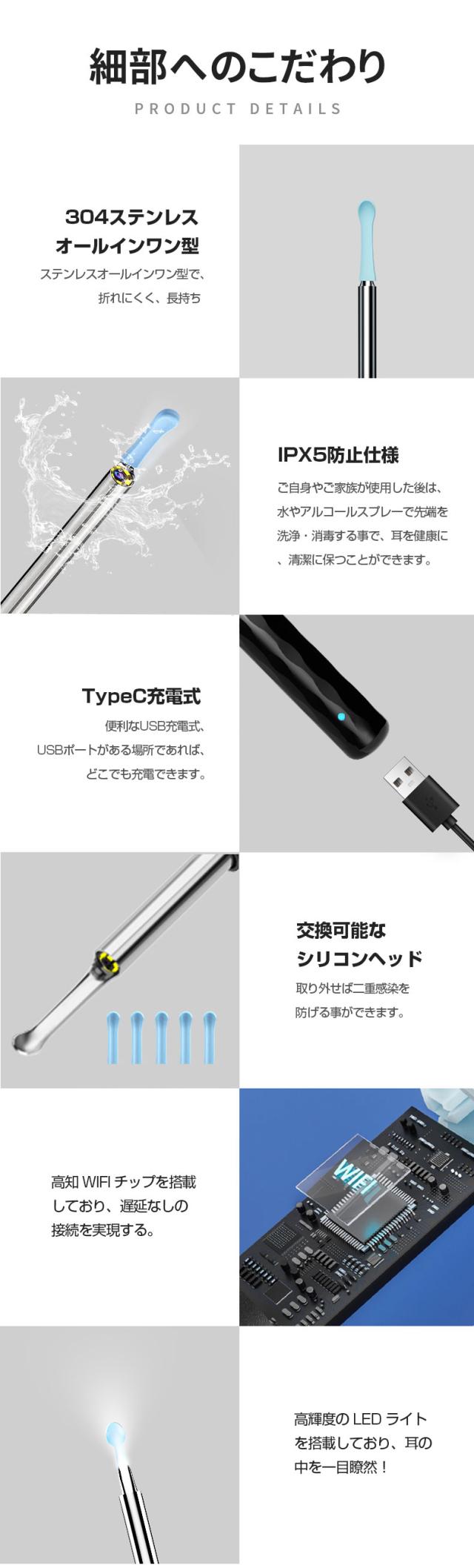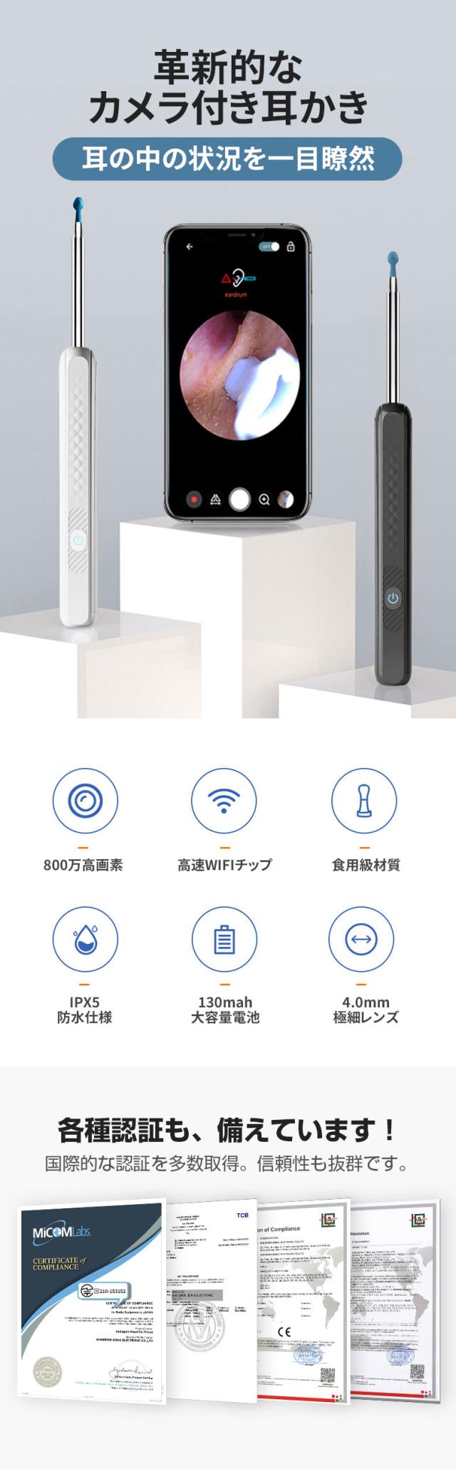 耳かき先端は6つのLEDライトと800万画素カメラを搭載し、超高精細な映像表示効果を実現、耳の中の様子をスマートフォンで気軽に確認しながら安全に耳掃除できます。